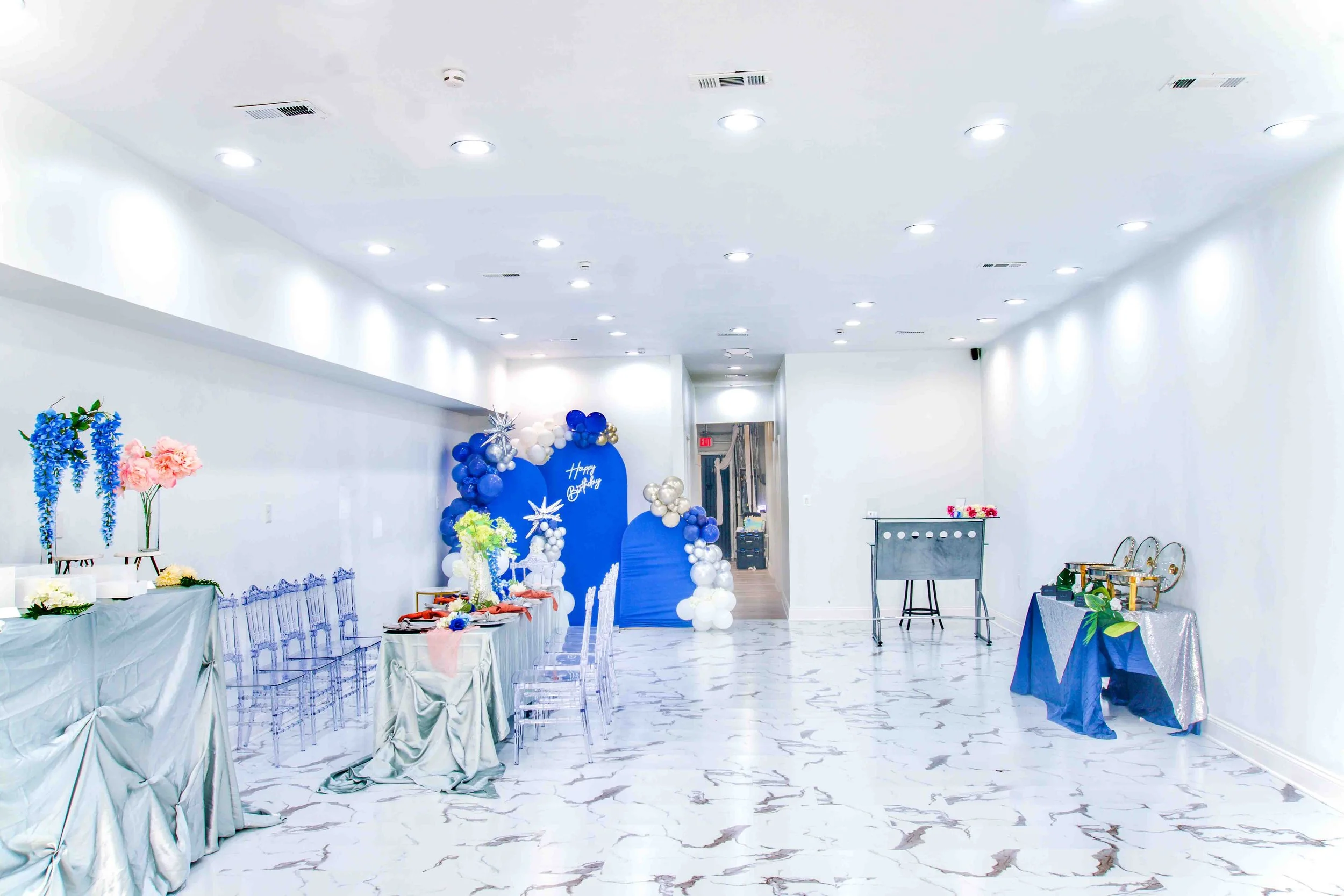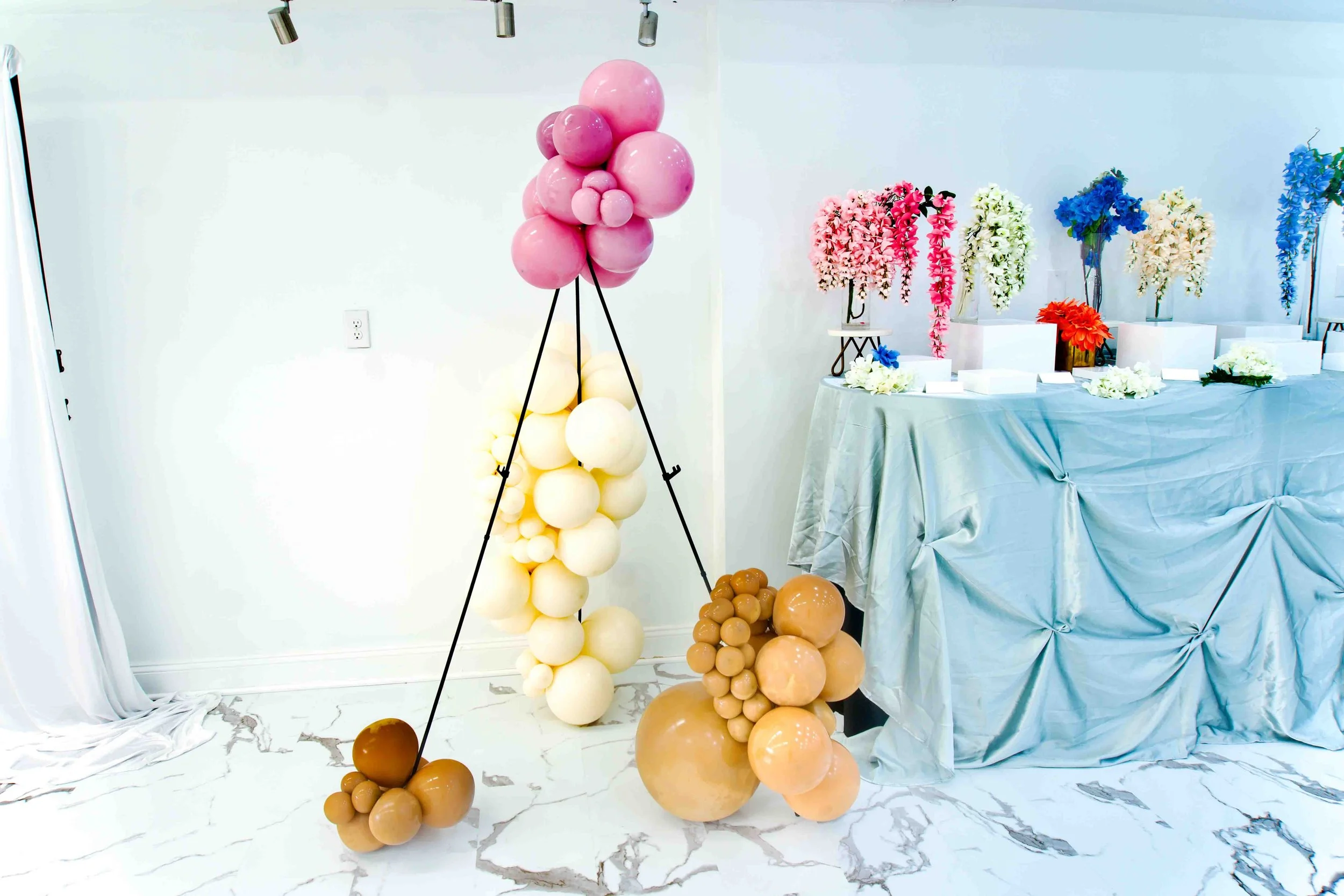 Create a light, beautiful setup for a baby or bridal shower with tables for favors, food, and photos. Keep it soft, simple, and stylish — perfect for intimate gatherings in a clean, photo-ready event rental space.